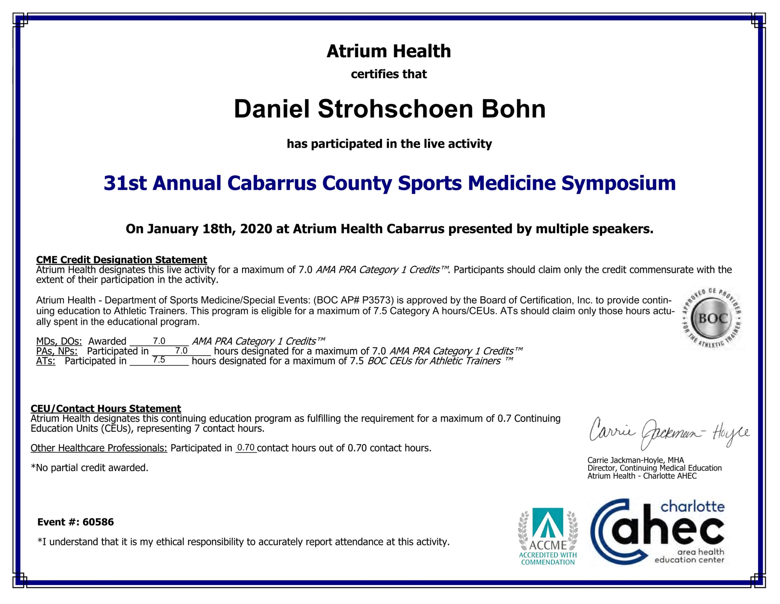 Fui um dos participantes do 31st Annual Cabarrus County Sports Medicine Symposium, evento organizado pelo Atrium Health (Charlotte AHEC) com certificação pela ACCME e pela BOC.