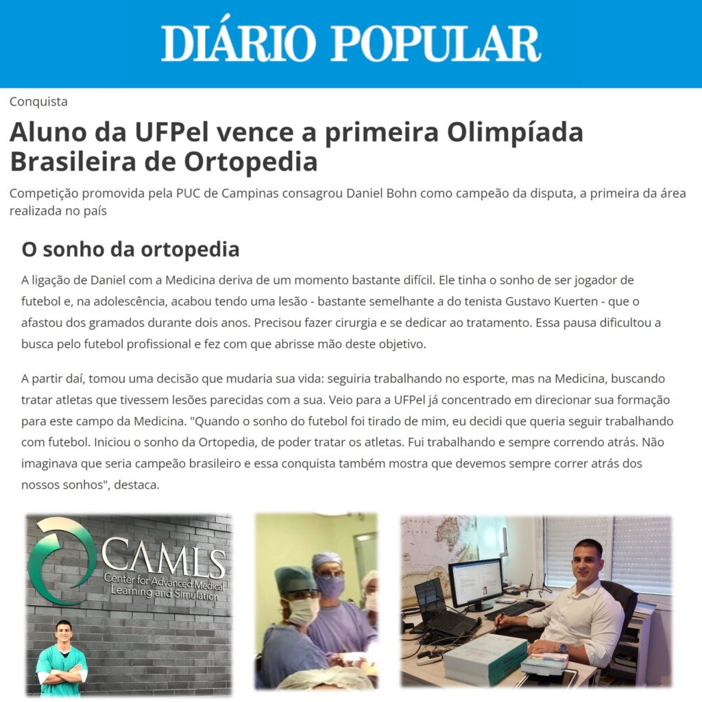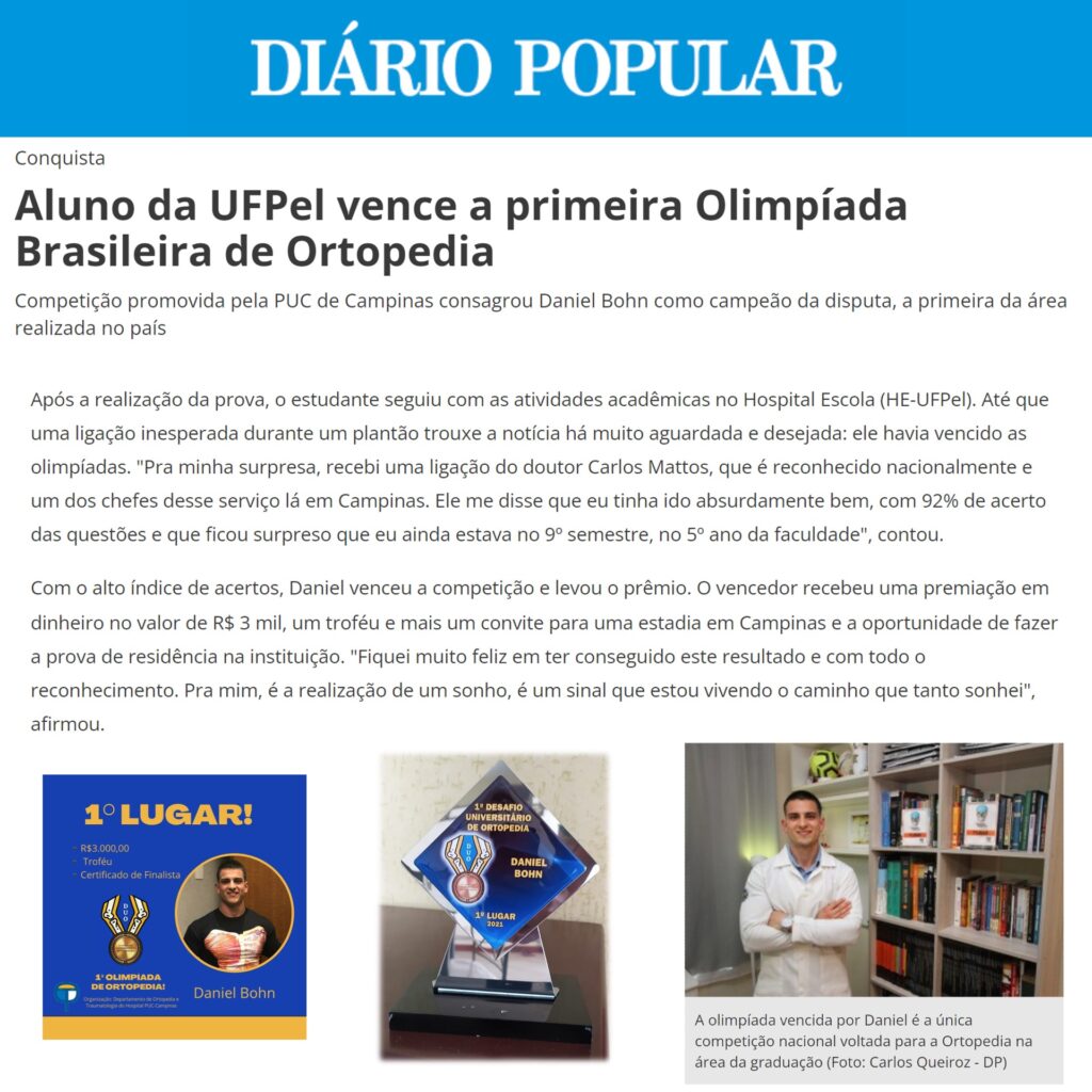 O estudante de Medicina Daniel Bohn, da Universidade Federal de Pelotas (UFPel), conquistou mais um importante marco acadêmico: o 1º lugar na inédita Olimpíada Brasileira de Ortopedia, promovida pela PUC-Campinas. A competição é considerada a primeira do país dedicada exclusivamente à ortopedia no nível da graduação.