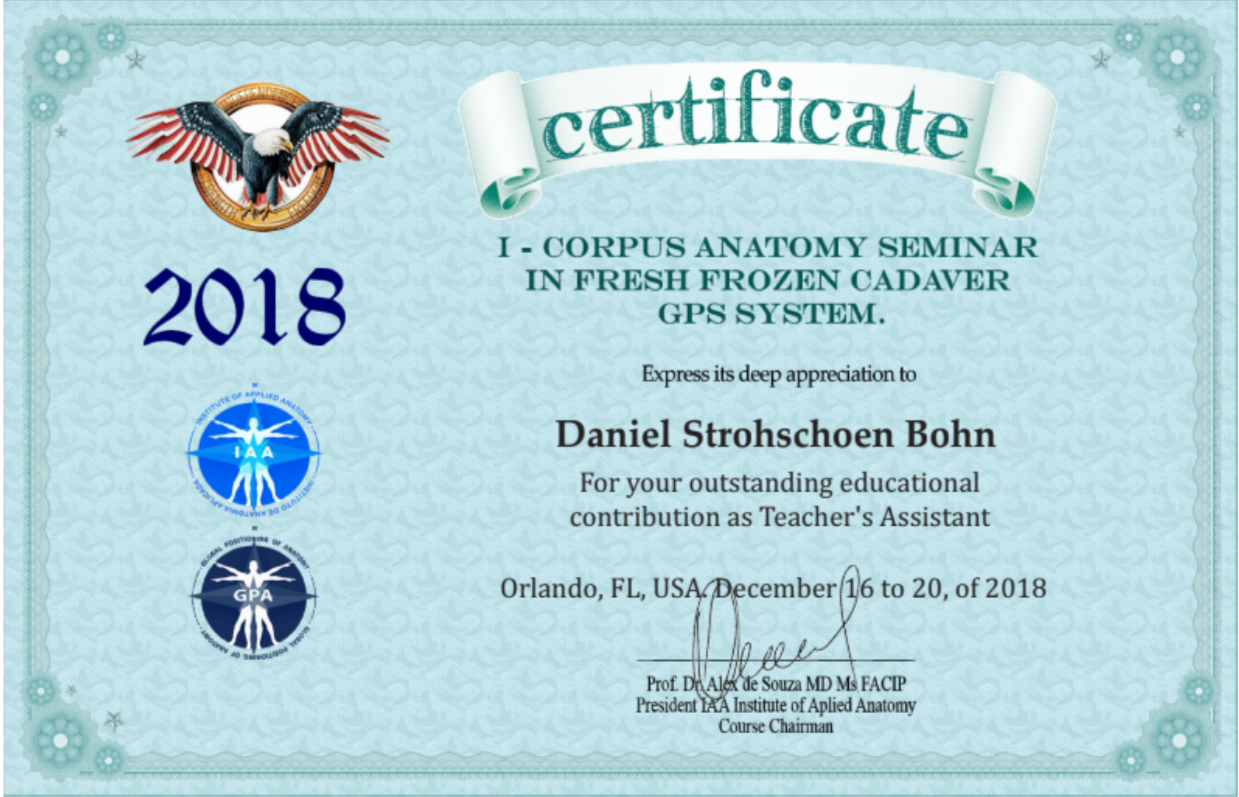 A capacitação é considerada como a maior em Anatomia Clínica do Mundo, garantida pelo Guiness World Records. Em seu certifcado constam 30h de dissecação em cadáveres frescos, além de práticas em procedimentos de Urgência e Emergência, entre outras atividades.
