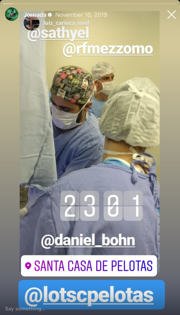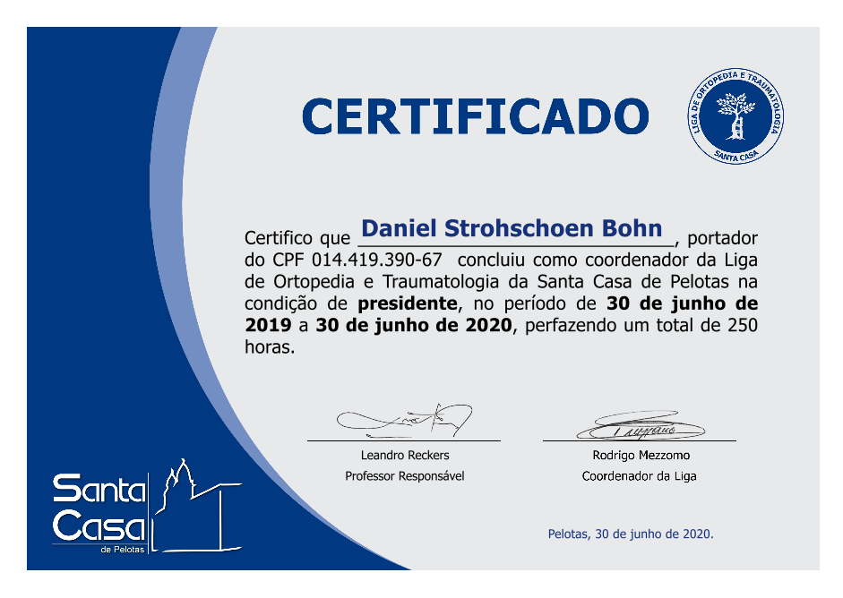 Entre 2019 e 2020, atuei como presidente da Liga de Ortopedia e Traumatologia da Santa Casa de Pelotas (LOTSC), ligada à Universidade Federal de Pelotas.