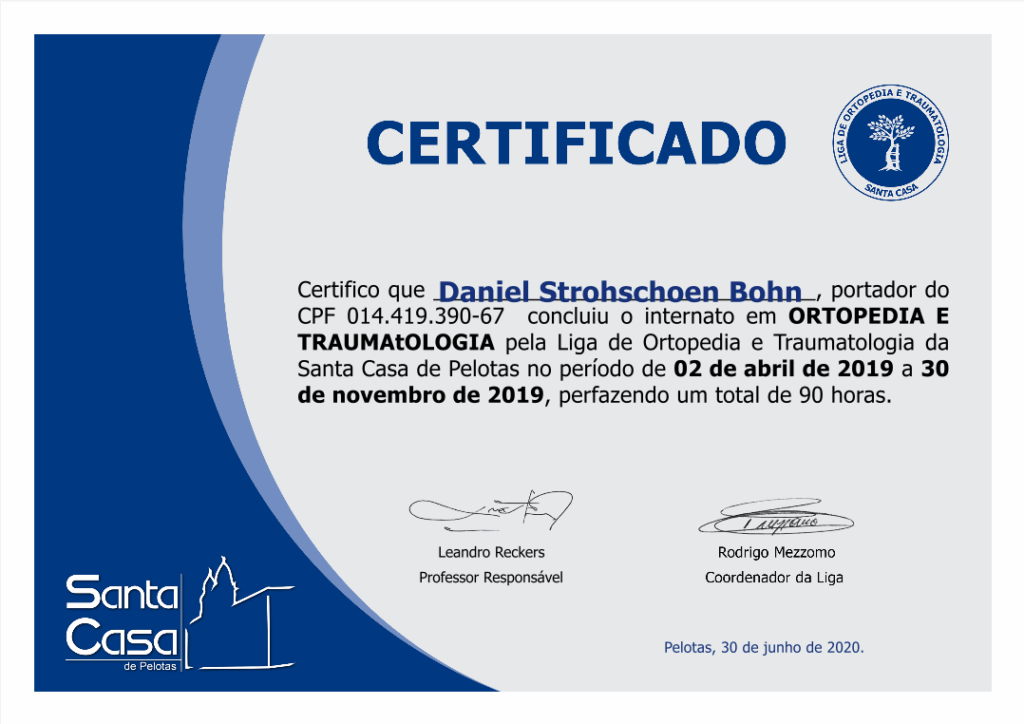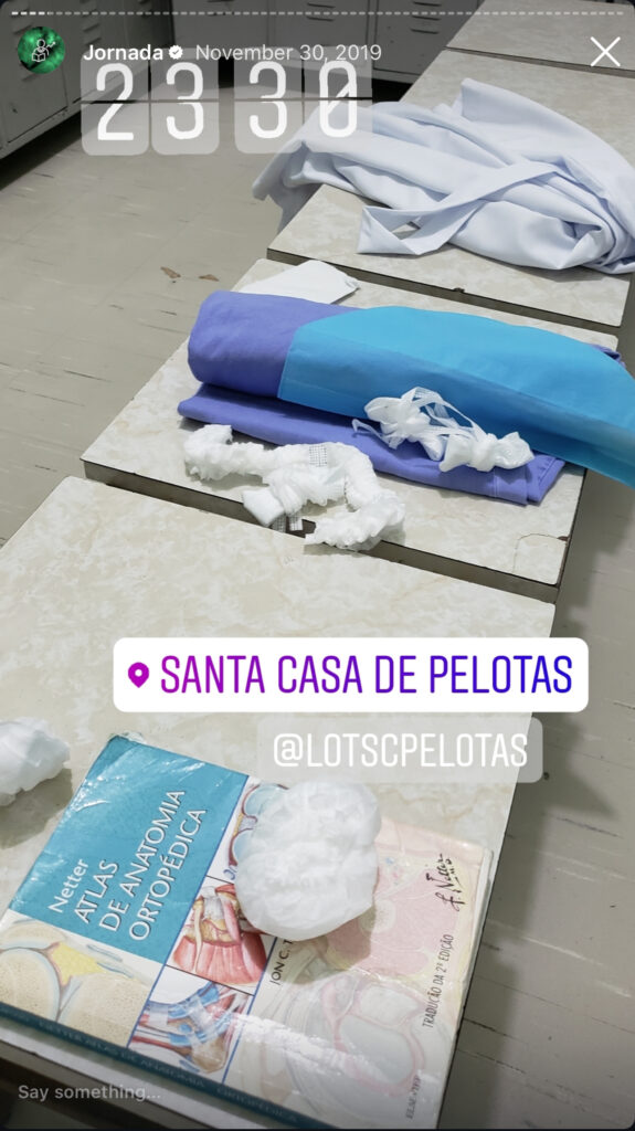 Paralelamente à parte prática e à organização interna, também concluí o internato prático oferecido pela liga, com 90 horas de atividades documentadas no serviço de ortopedia da Santa Casa, sob supervisão do corpo clínico e da preceptoria da UFPel.