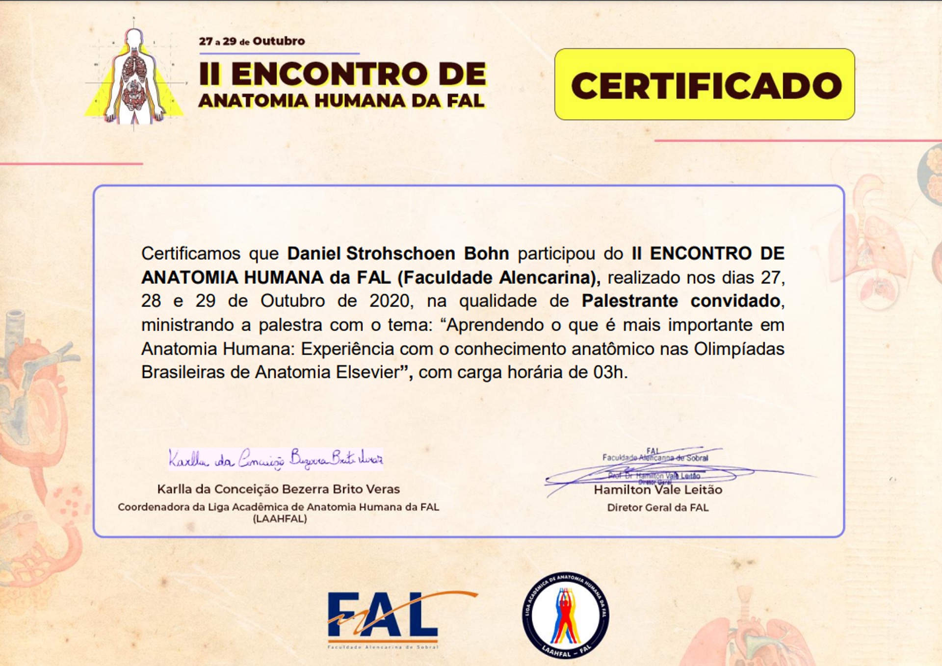 Em outubro de 2020, tive a honra de ser convidado como palestrante no II Encontro de Anatomia Humana da Faculdade Alencarina (FAL) – um evento de alcance nacional realizado de forma 100% online, com transmissão a estudantes e profissionais da saúde de todo o Brasil.